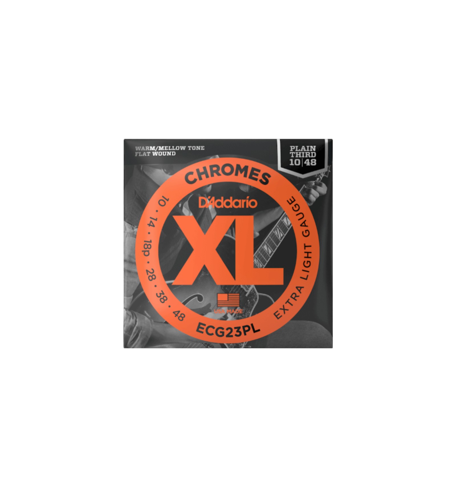XL Chromes are our warmest, mellowest electric guitar strings. Beloved by jazz guitarists, as well as blues legends like Gary Clark Jr., these flat wound strings provide the smoothest feel and warmest tone, while allowing movement across the fretboard with no finger noise. Made with a high carbon steel core, Chromes’ stainless steel flattened ribbon wire is expertly wound onto a series of interlocking under-windings, then precisely polished for unparalleled smoothness and a sound which blends beautifully into any mix. 10-48 Extra Light Plain Third is our lightest gauge of flatwound strings and is made with a plain steel G-string for additional flexibility.