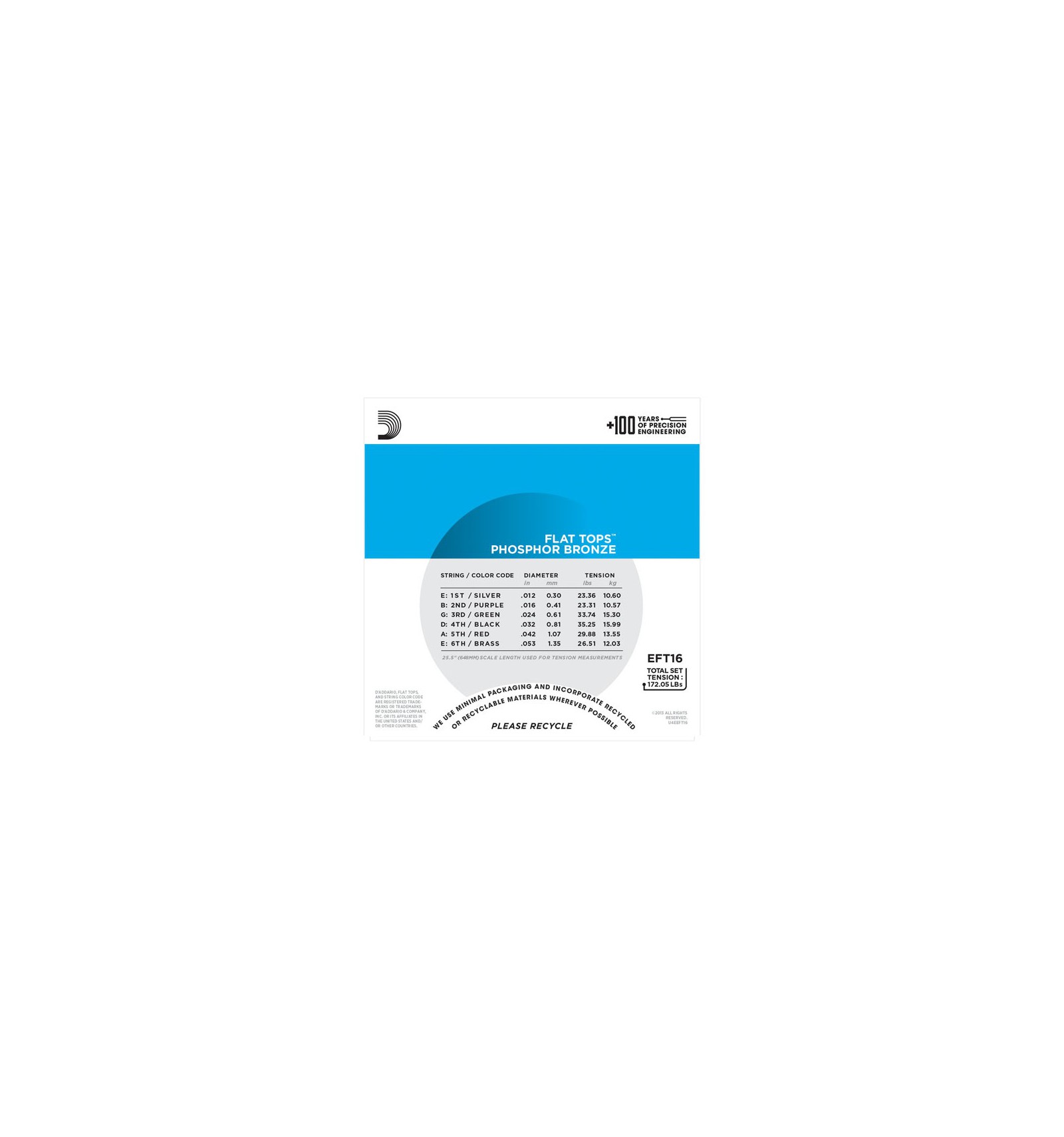 Die Flat Top Saiten von D'Addario sind mit Runddraht umsponnen („roundwound“) und dann präzise geschliffen, so dass die äußere Fläche glatt und „semi-flat“ bleibt. Dieses Verfahren resultiert in einer glatten, abgeflachten Spieloberfläche, ohne den warmen Klang und das Sustain der Phosphorbronze-Saiten zu beeinträchtigen. Flat Tops eignen sich sehr gut für Tonaufnahmen und Flat-Picking.