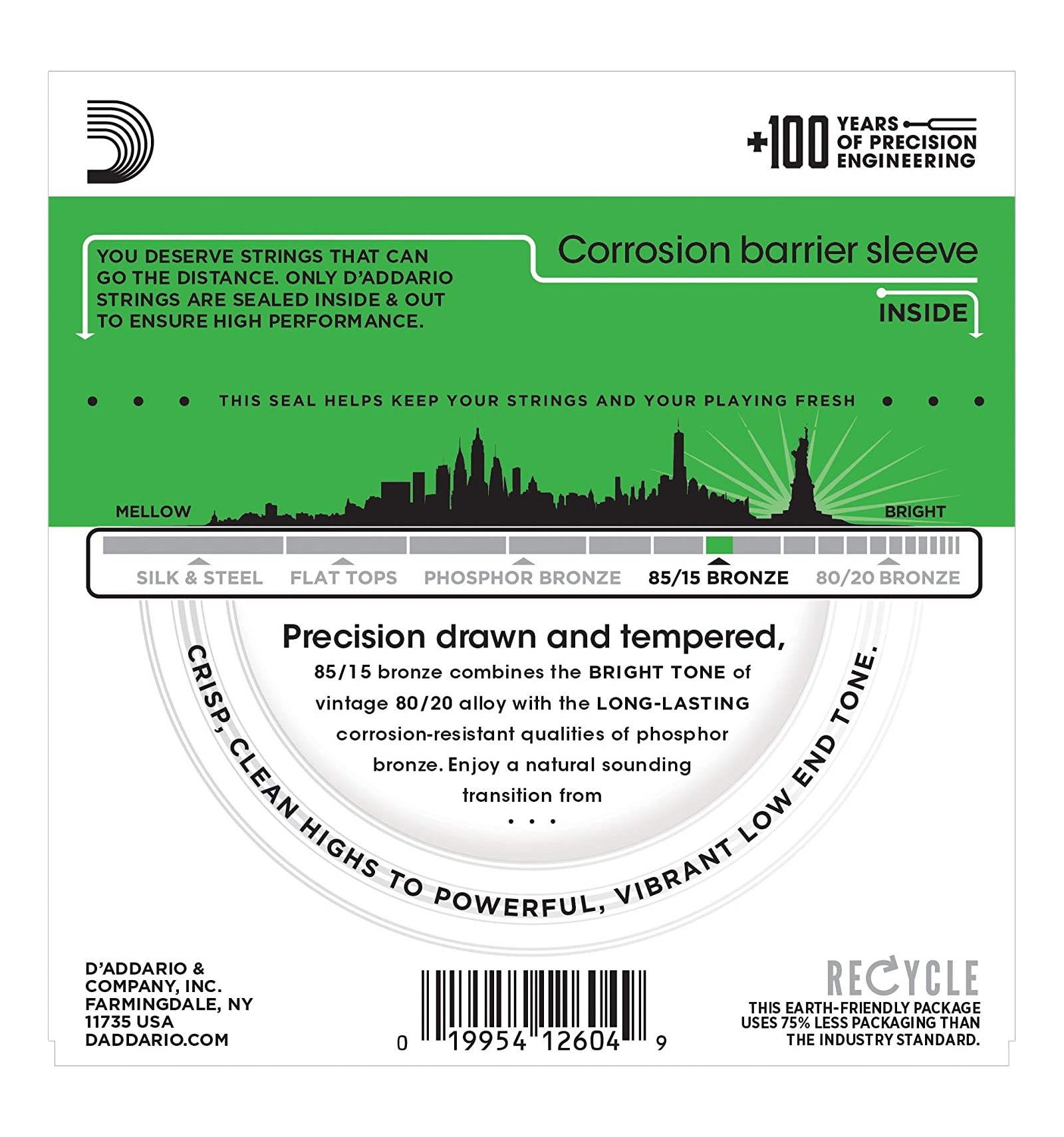 85/15 Bronze verbindet den glasklaren Klang von 80/20 Bronze mit der längeren Haltbarkeit von Phosphorbronze. Der 85/15 Bronzedraht ist um einen präzise gezogenen hexagonalen Kern aus Kohlenstoffstahl gesponnen, was zu einem lang anhaltenden, hellen Ton mit hervorragender Intonation führt.