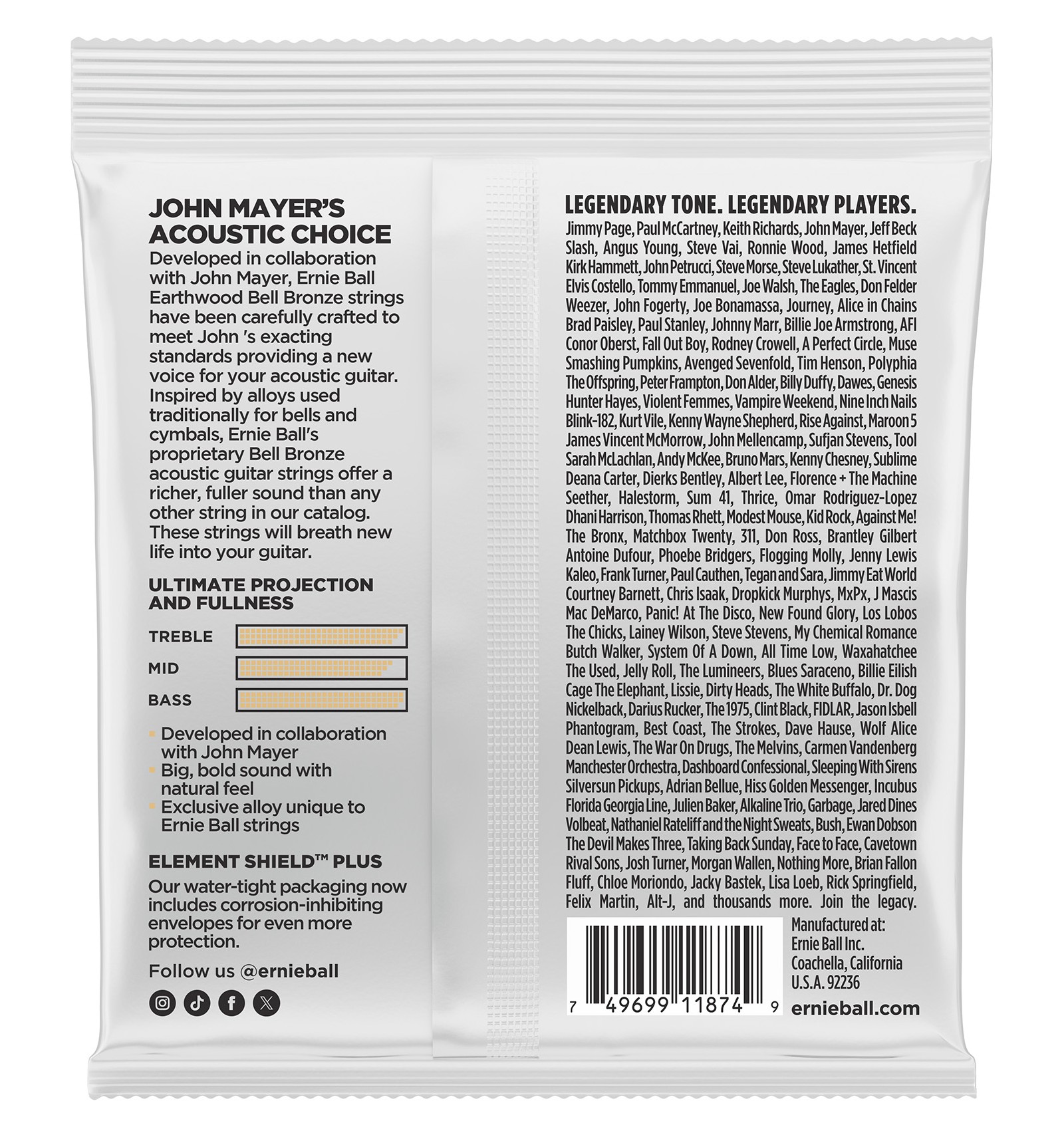 Developed in collaboration with John Mayer, Ernie Ball Earthwood Bell Bronze strings have been carefully crafted to meet John's exacting standards, providing a new voice for your acoustic guitar. Inspired by alloys used traditionally for bells and cymbals, Ernie Ball's proprietary Bell Bronze acoustic guitar strings offer a richer, fuller sound than any other string in their catalog. These strings will breathe new life into your guitar!