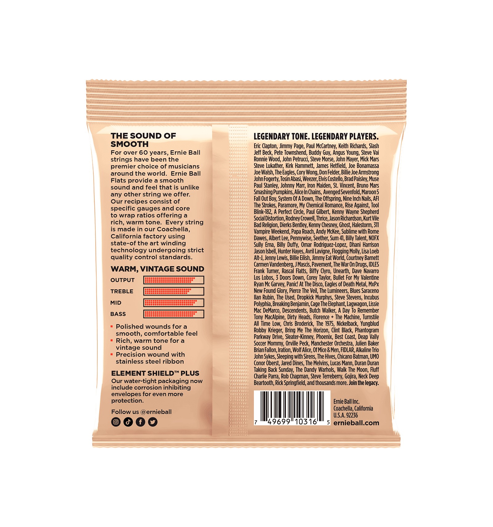 Ernie Ball Stainless Steel Flatwound guitar strings are the perfect complement for players seeking a warm, mellow tone and a smooth vintage feel. The wound strings are constructed with tin-plated steel hex cores, wound with a stainless steel ribbon wrap that has been polished to a smooth glass-like finish. The resulting sound is vintage-inspired with a dark, smooth fundamental. Due to the polished flat ribbon surface, the inherent finger noise with traditional strings is virtually eliminated making these strings a favorite among Jazz players and session recording artists alike.