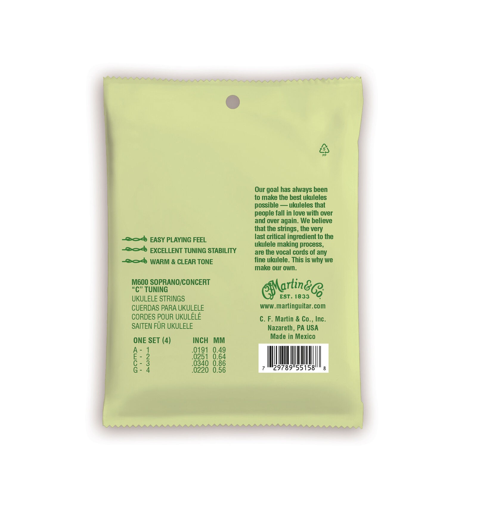 Hören Sie wie gut Ihre Ukulele klingen kann mit neuen Martin Saiten. Hergestellt aus klarem Fluorocarbon für verbesserte harmonische Intonation. Diese Saiten bieten eine angenehme, warme Klangfarbe und gewährleisten eine hohe Stimmstabilität.
