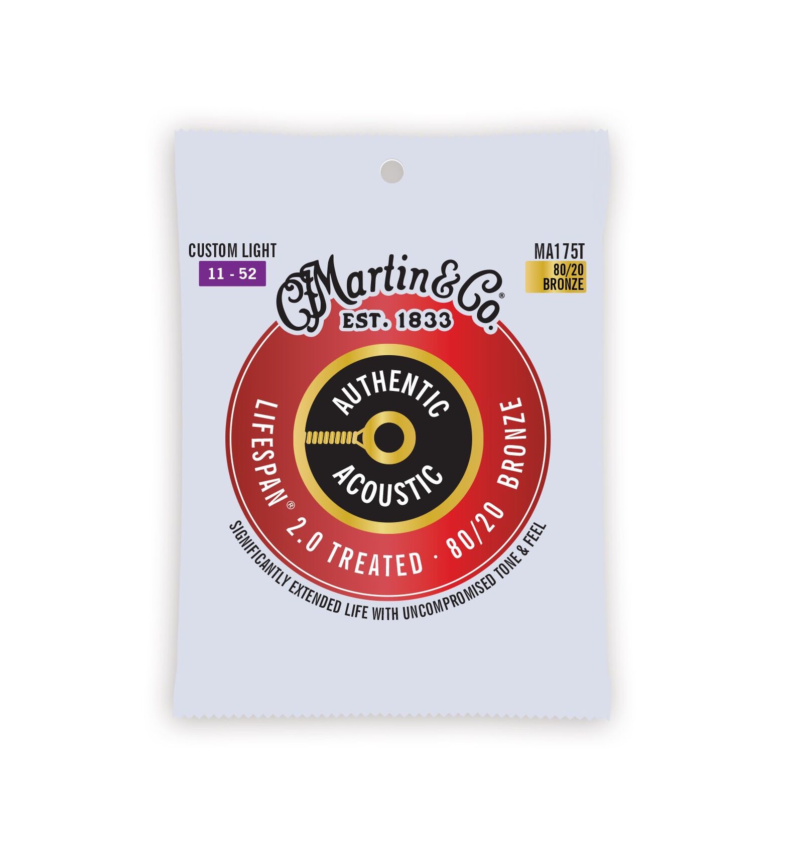 Martin’s next generation Lifespan 2.0 strings are engineered using a new, patented technology only available from Martin. This technology was developed to protect the core wire and the wrap wire to prevent corrosion without compromising tone – the single most important attribute of the guitar strings. Authentic Acoustic Lifespan 2.0 strings look better, sound better, and feel better, providing a smooth playing experience that reduces finger drag. We invested two years developing our next generation Lifespan 2.0 strings to ensure they will sound better, longer than any other extended-life string on the market. Available in 80/20 Bronze and 92/8 Phosphor Bronze.