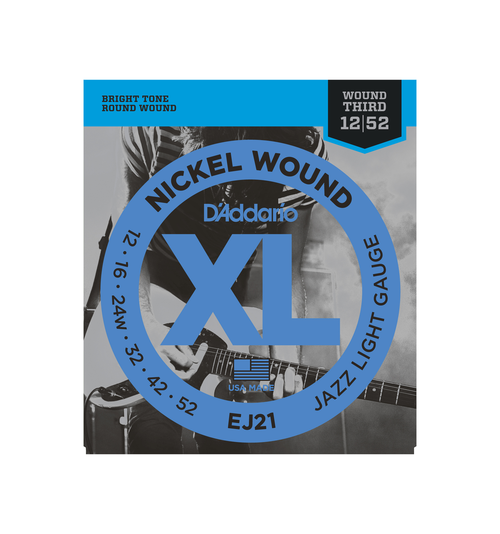 EJ21, D'Addario's most popular round wound "jazz" set, features a wound 3rd/G string for greater resonance and a tighter feel. Can also be used for down tuning.