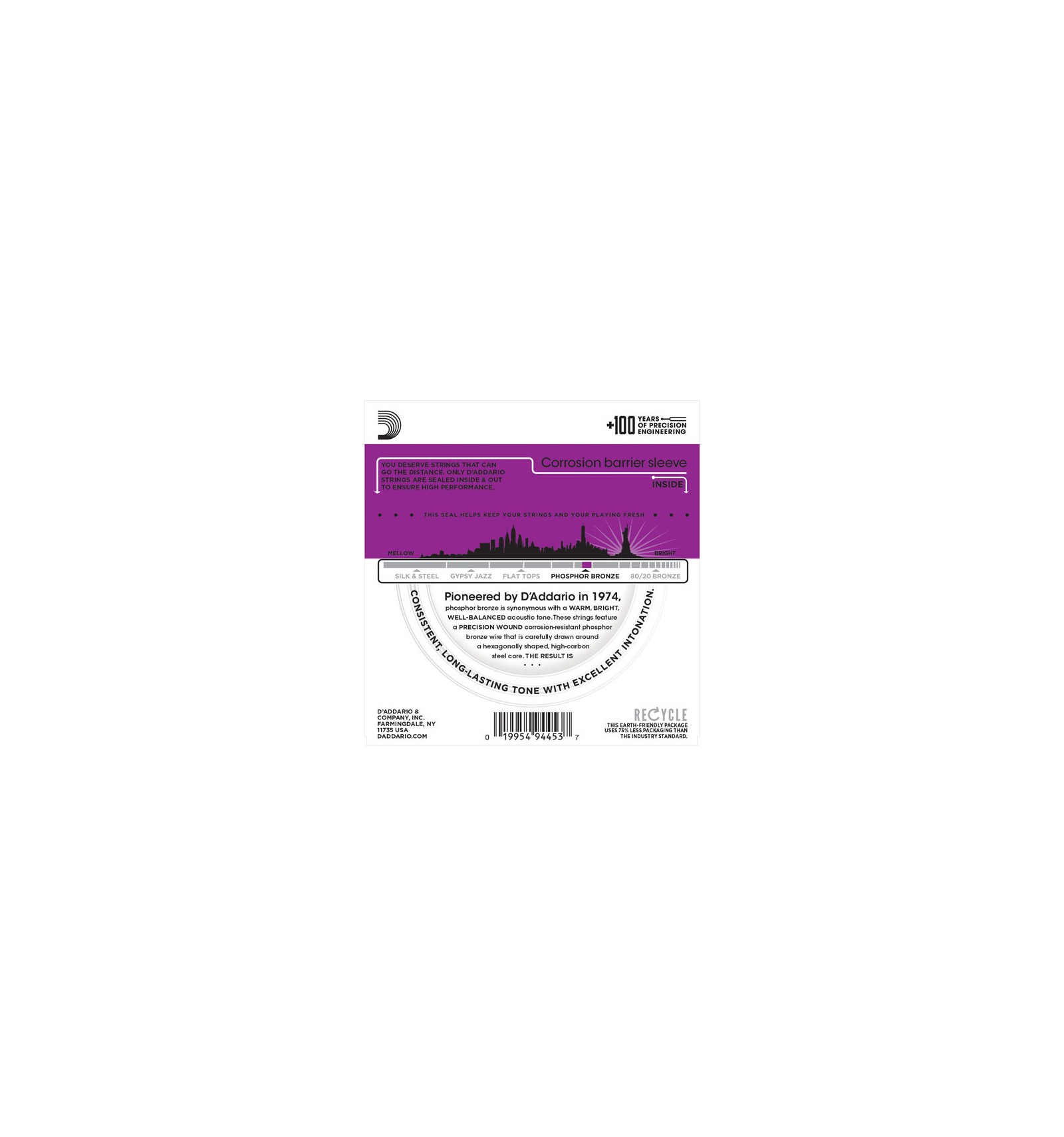 Phosphor Bronze was introduced to string making by D'Addario in 1974 and has become synonymous with warm, bright, and well balanced acoustic tone. D'Addario Phosphor Bronze strings are precision wound with corrosion resistant phosphor bronze onto a carefully drawn, hexagonally shaped, high carbon steel core. The result is long lasting, bright sounding tone with excellent intonation