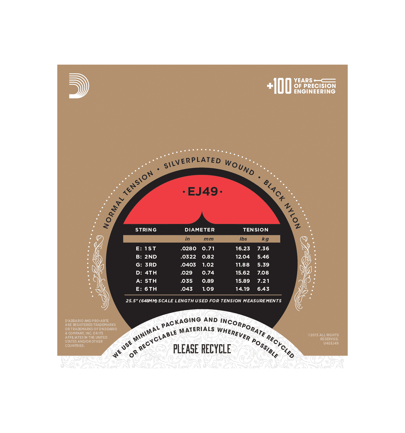 EJ49, normal tension, is D'Addario's best selling classical set containing black nylon trebles, preferred for its balance of rich tone, comfortable feel and dynamic projection.