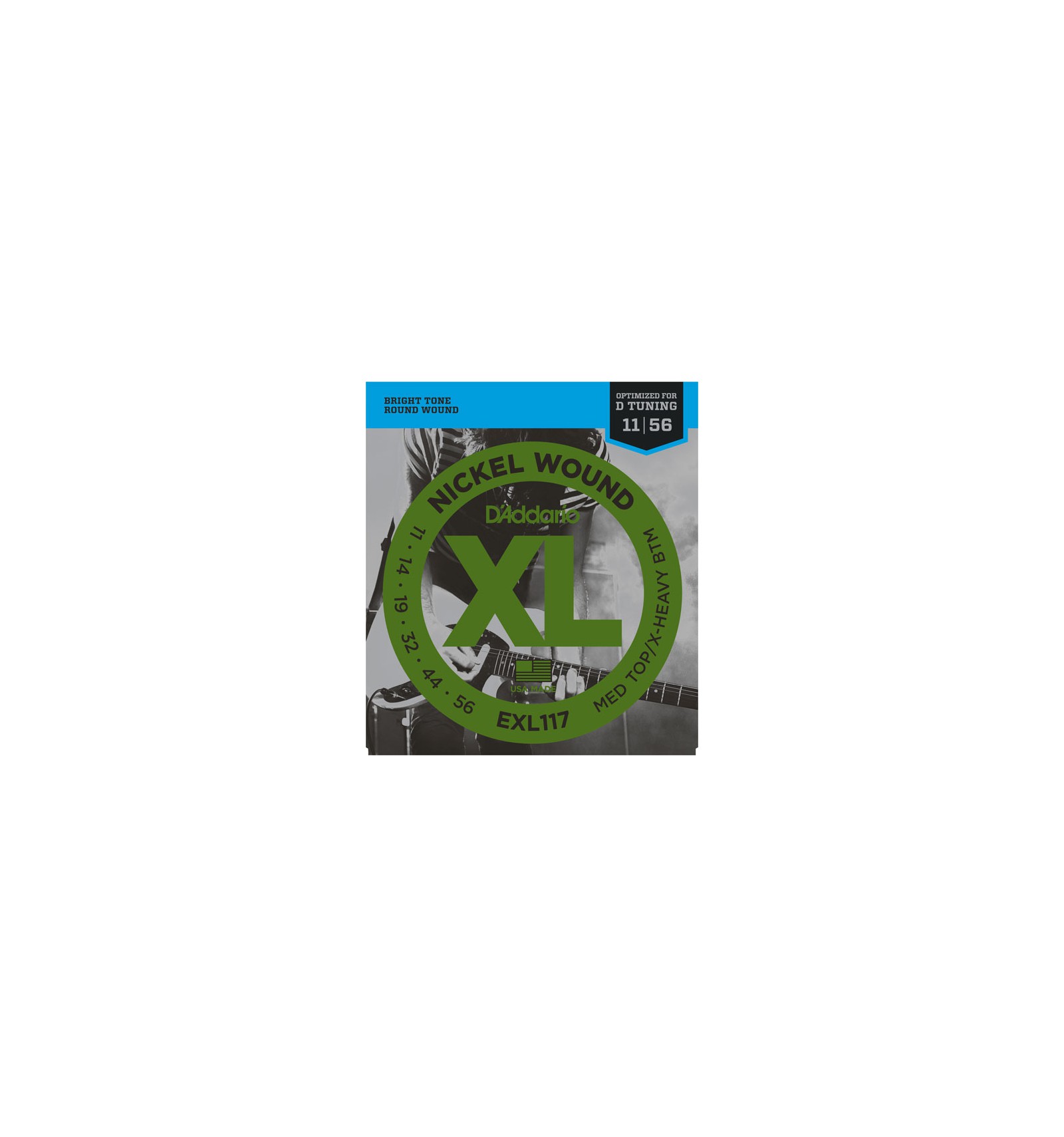 EXL117 is an extreme hybrid set, optimally designed for tuning guitars down a whole step to D, while maintaining a comfortable playing tension like that of a "light" gauge set.