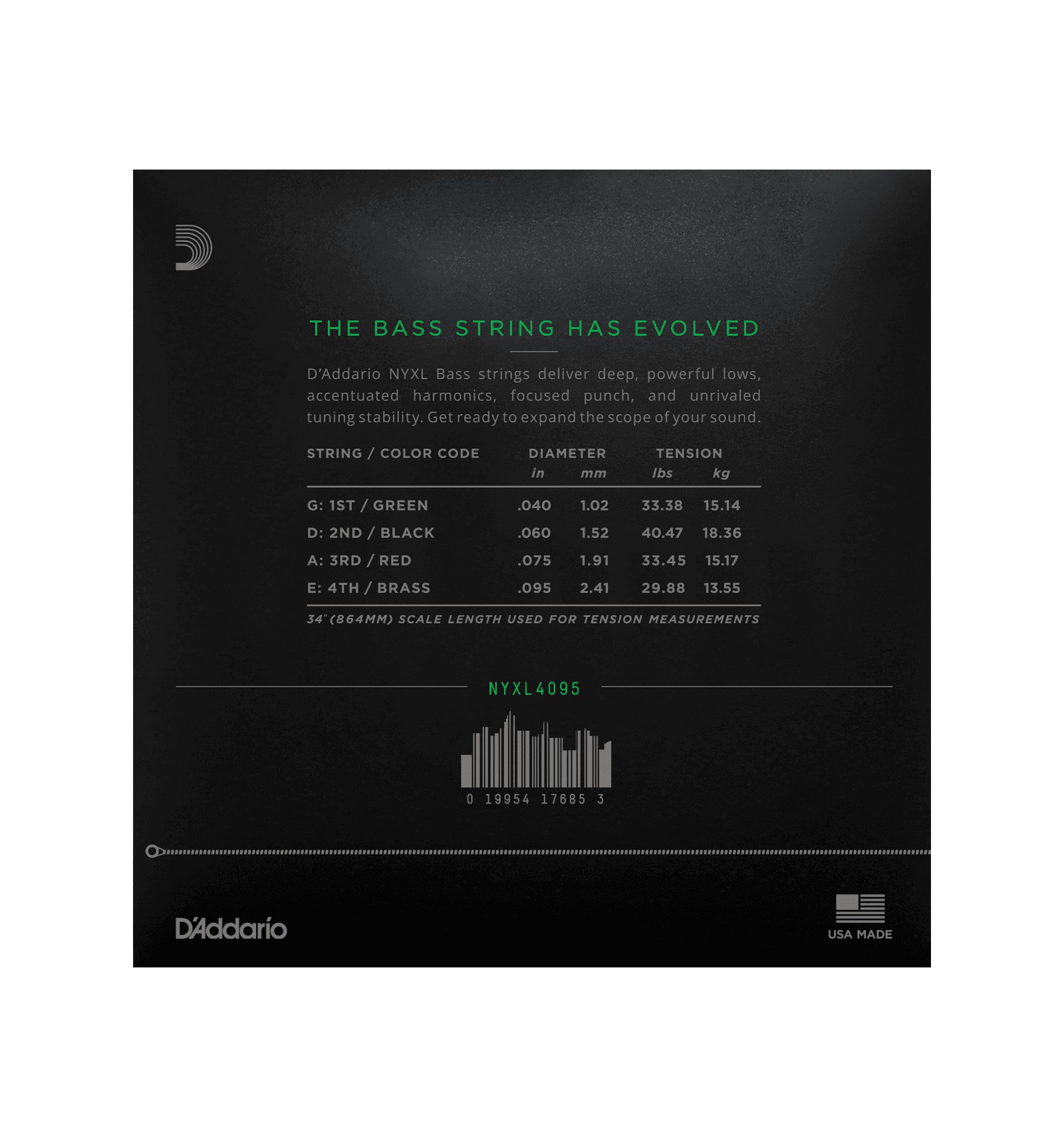 NYXL Bass features our high carbon NY Steel core wrapped with our reformulated nickel-plated steel. This new construction delivers deep, powerful lows, focused punch, and accentuated harmonics. Designed for all playing styles, NYXL Bass provides more dynamic range and sustain than any other bass string.