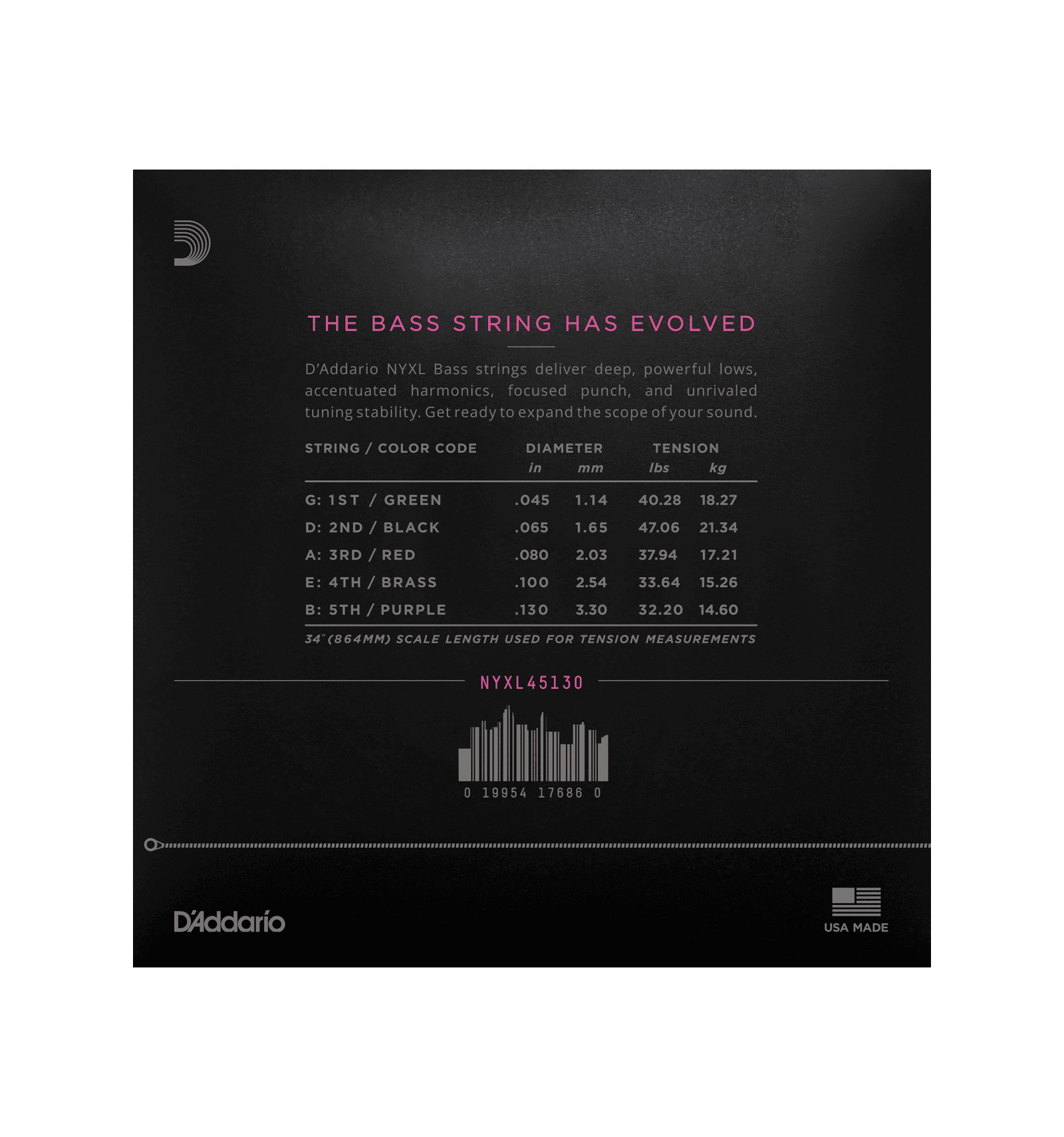 NYXL Bass features our high carbon NY Steel core wrapped with our reformulated nickel-plated steel. This new construction delivers deep, powerful lows, focused punch, and accentuated harmonics. Designed for all playing styles, NYXL Bass provides more dynamic range and sustain than any other bass string.