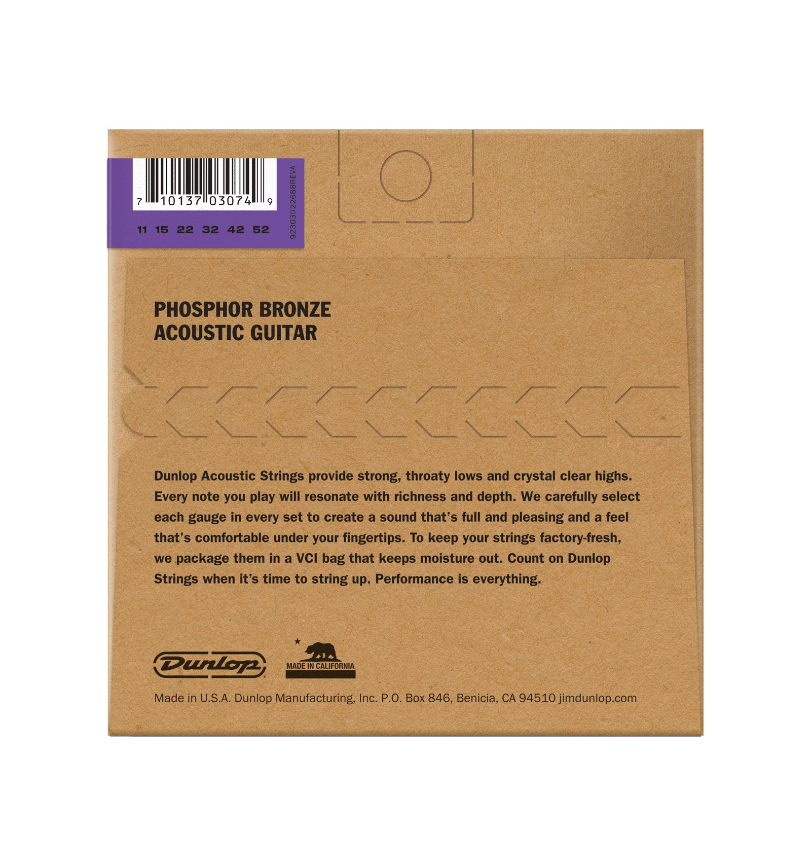 Dunlop Phosphor Bronze acoustic guitar strings begin with the finest materials. Custom wound onto a high carbon steel hex core, they offer players a warm full-bodied tone with incredible clarity and dynamics.