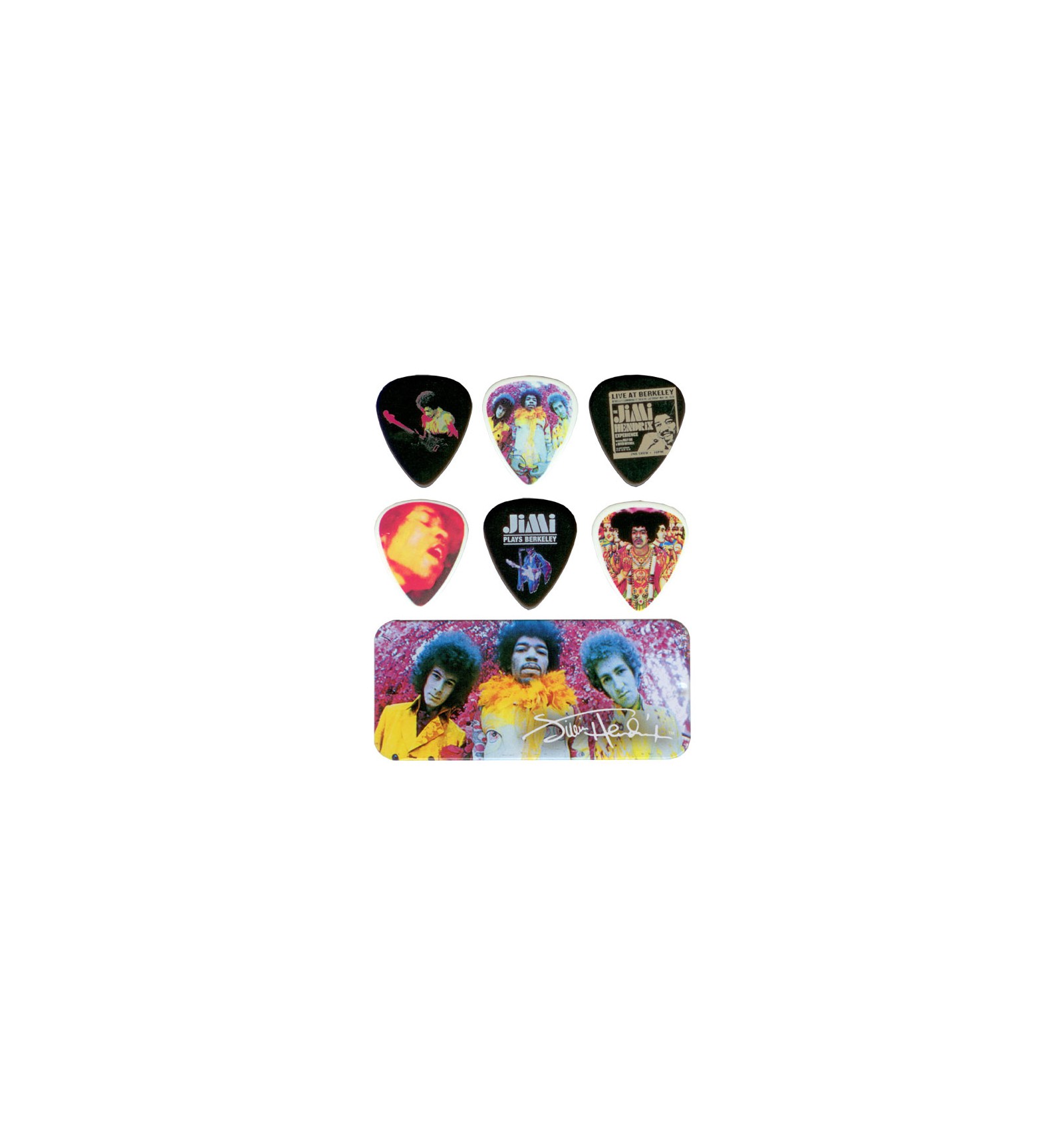 La boite contient: . 2 médiators Are You Experienced . 2 médiators Bold As Love . 2 médiators Electric Ladyland . 2 médiators Band of Gypsys . 2 médiators Jimi Plays Berkeley . 2 médiators The Jimi Hendrix Experience : Live at Berkeley