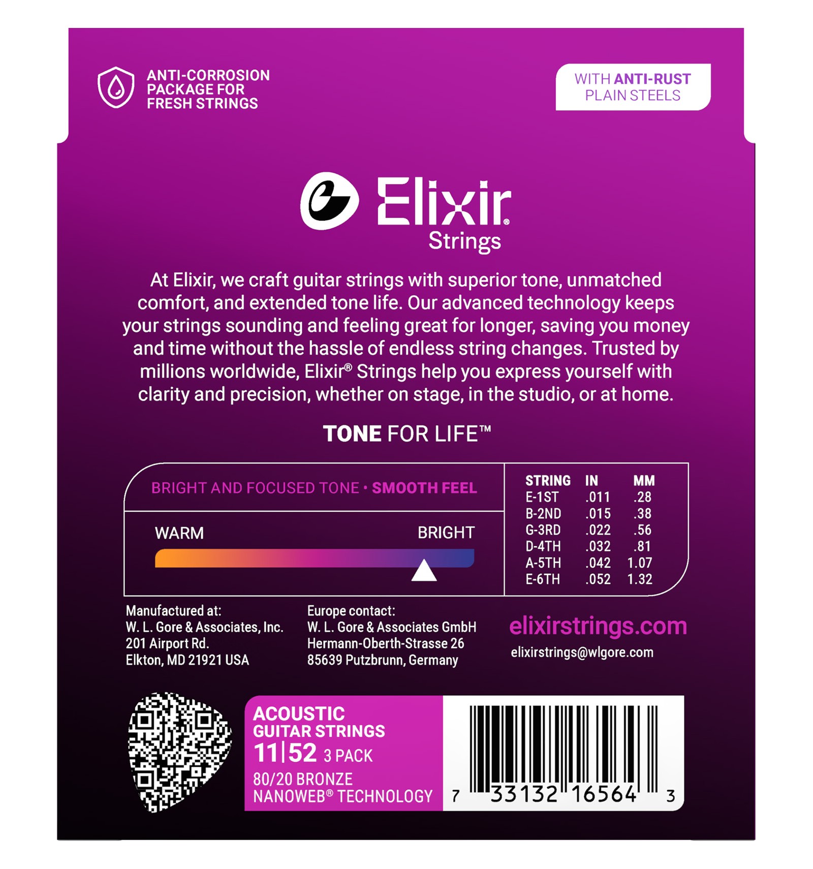 Elixir Acoustic Nanoweb strings don't just sound great; their micro-thin coating keeps them sounding great for a lot longer than average strings. If you want to keep your guitar tone consistently great day in and day out, put on a set of Elixir Acoustic Nanoweb strings. Their coating actually cuts down on unnecessary finger friction. You'll be amazed at how long they last! Fewer string changes means having to buy strings less often.