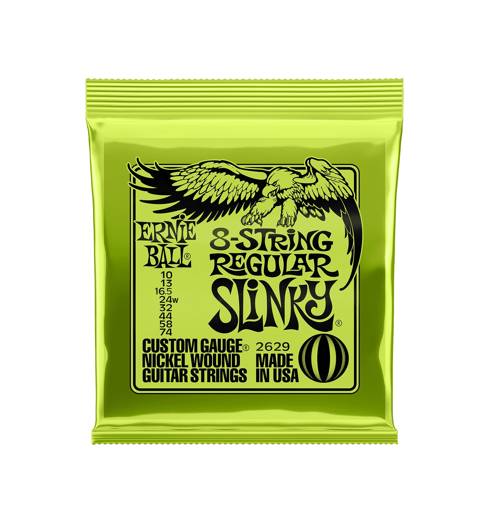 Ernie Ball Regular Slinky Electric Strings are the top selling set, and are favored by many musicians around the globe. Regular Slinky strings are played by Eric Clapton, John Mayer, Steve Vai and legions of guitar players worldwide. These strings are precision manufactured to the highest standards and most exacting specifications to ensure consistency, optimum performance, and long life. Regular Slinky wound strings are made from nickel plated steel wire wrapped around a hex shaped steel core wire. The plain strings are made of specially tempered tin plated high carbon steel producing a well balanced tone for your guitar.