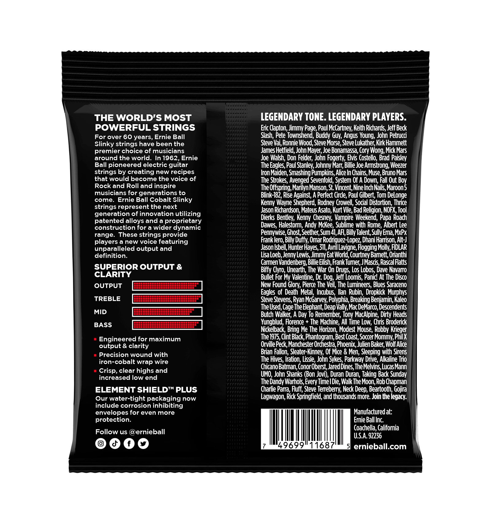 Engineered to maximize output and clarity, Ernie Ball Cobalt Slinky Guitar Strings are the latest innovation in string technology. Seeking to provide guitarists with a new voice, Cobalt strings provide an extended dynamic range, incredible harmonic response, increased low end, and crisp, clear highs. Cobalt provides a stronger magnetic relationship between pickups and strings than any other alloy previously available. Cobalt Slinkys are also soft and silky to the touch, making string bending a breeze.