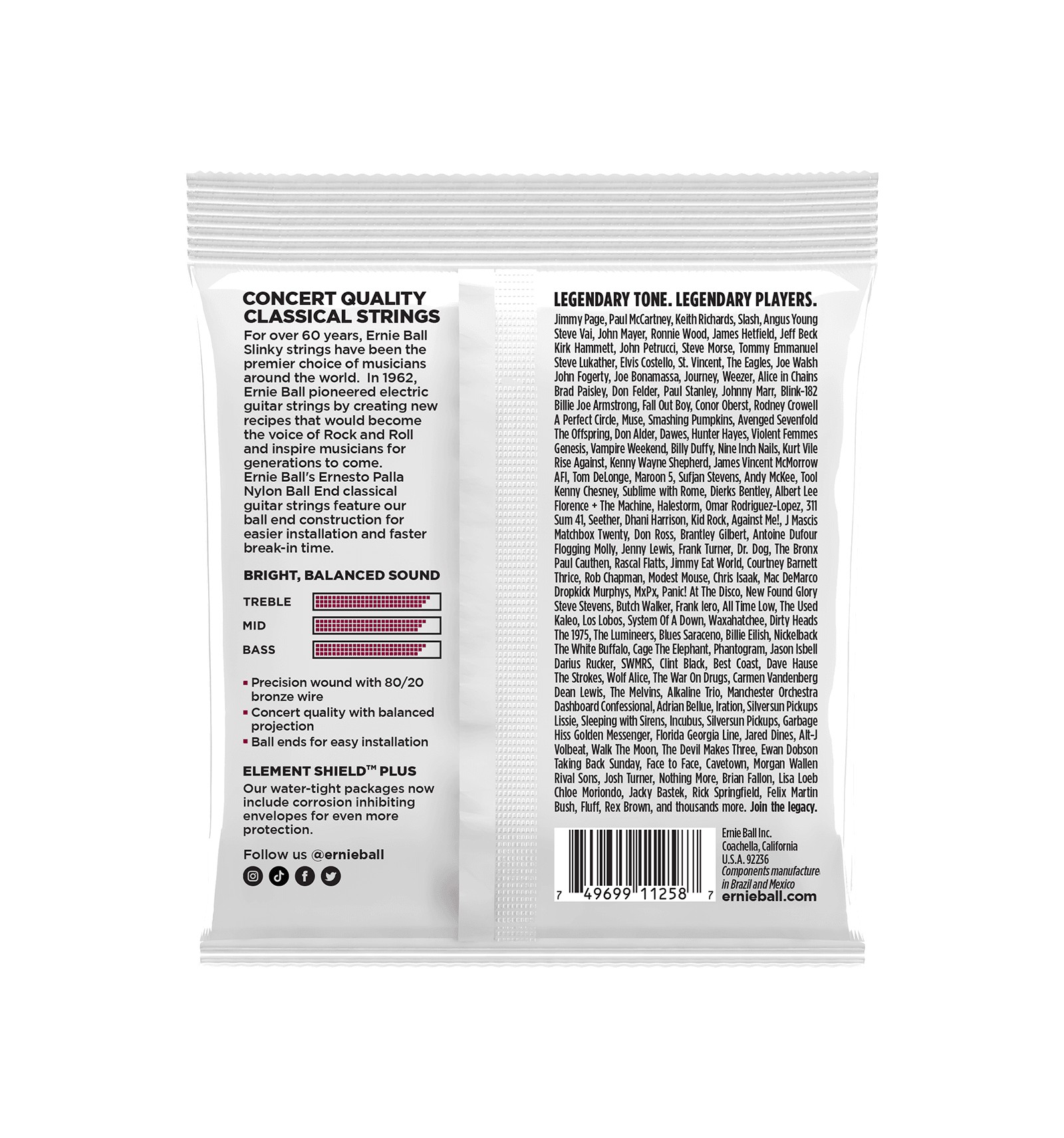 Ernie Ball Ernesto Palla concert quality classical guitar treble strings are made of clear nylon monofilament. Silver wound basses are made of silver plated copper wrapped around a nylon multifilament core providing a smooth, rich tone. All Ernie Ball strings are precision manufactured to the highest standards and most exacting specs to assure consistency, optimum performance, and long life.