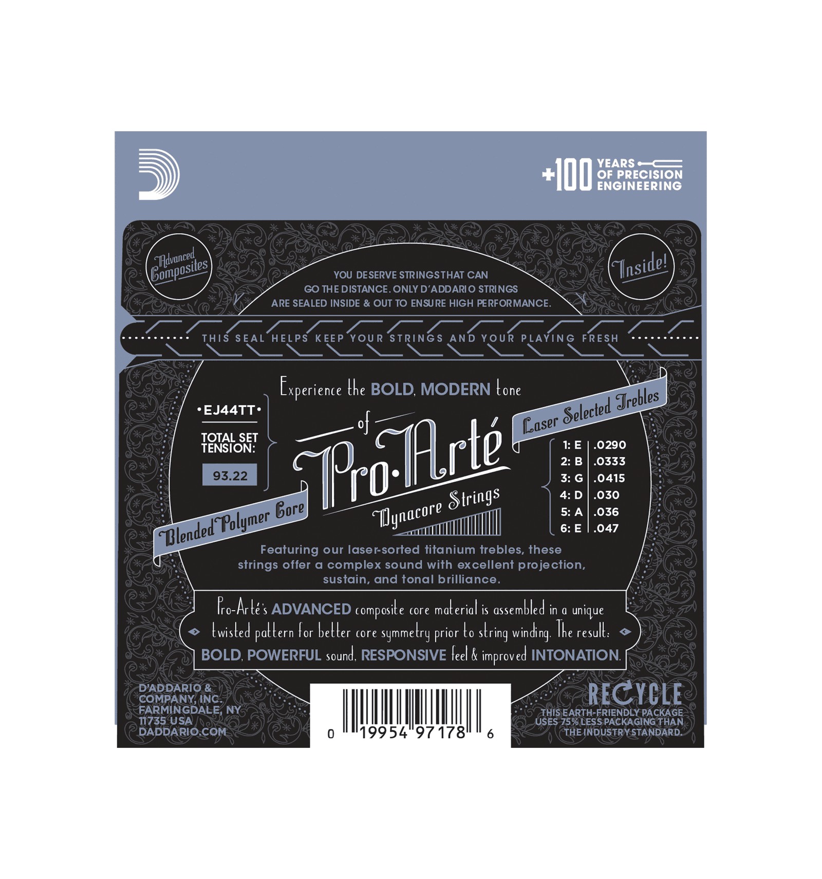 Les jeux Pro Arte DynaCore sont fabriqués à partir de fibres denses de monofilament. Ce matériau exclusif développé par D'Addario est lié à un procédé de bobinage révolutionnaire, le tout procurant un son unique, très contemporain. Le son est riche, rond et plein avec une durée de vie accrue, une stabilité de l'accord et une vraie consistance. Ces jeux ont en plus des aigües titanium qui ajoutent de la brillance et de la projection pour une balance sonore optimale.