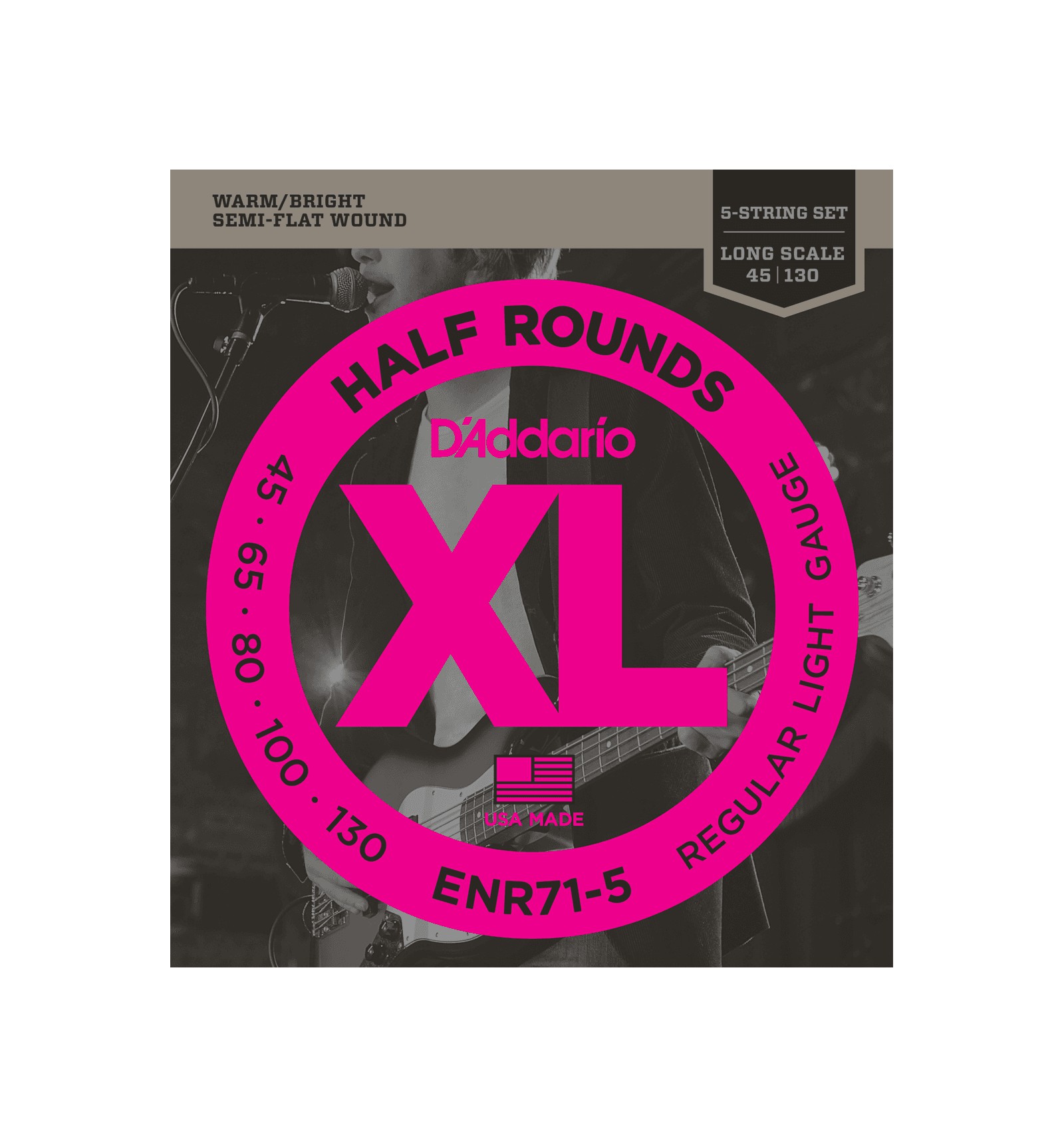 ENR71-5's combine the playability of common 45-130 gauged 5-string sets with the benefits of an exclusive "Half Round" manufacturing process. This set is fit for long scale basses with a string scale length of up to 36 1/4 inches.