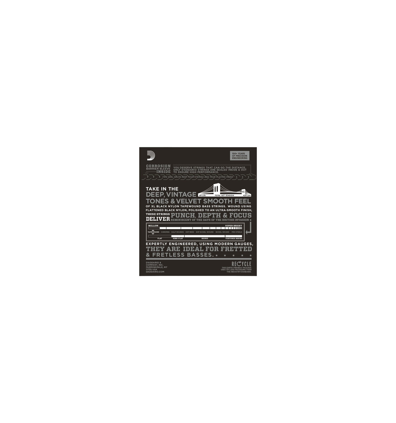 Diseñadas para producir un tono profundo y cálido, con un tacto suave, las cuerdas D'Addario Tapewound Bass strings se enrollan con un nylon negro aplanado que es pulido para un acabado ultra-suave. Estas cuerdas duraderas y bien equilibradas han sido diseñadas especialmente para proporcionar una tensión óptima y se calibran para encajar correctamente en selletas y cejuelas estándar. Las Tapewounds se pueden utilizar en bajos con trastes o fretless y están diseñados para ofrecer un tono vintage que va desde el ''thump'' de un contrabajo a la profundidad de las cuerdas de entorchado plano tradicionales.