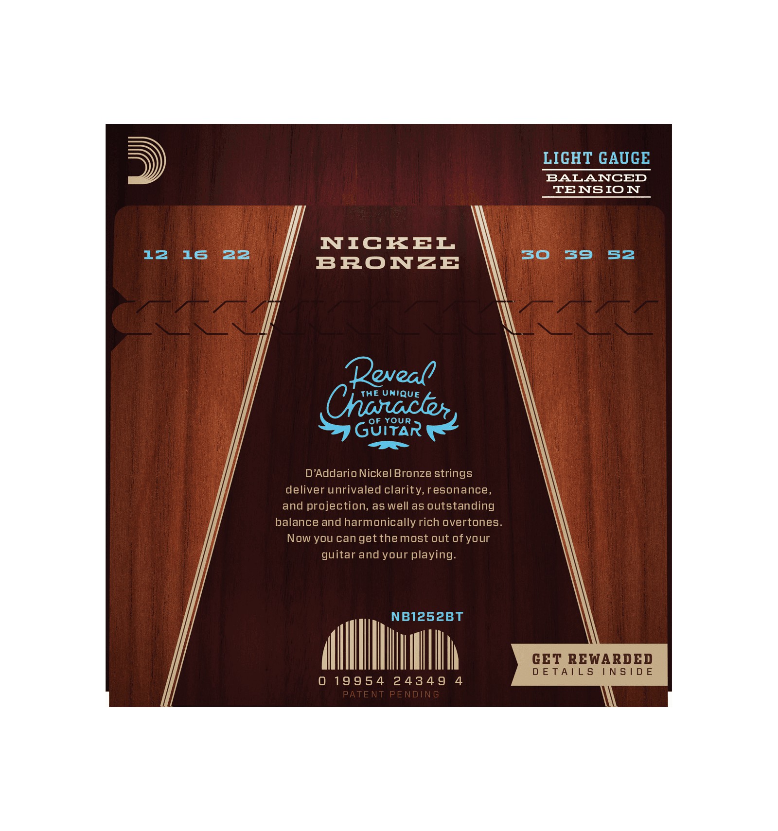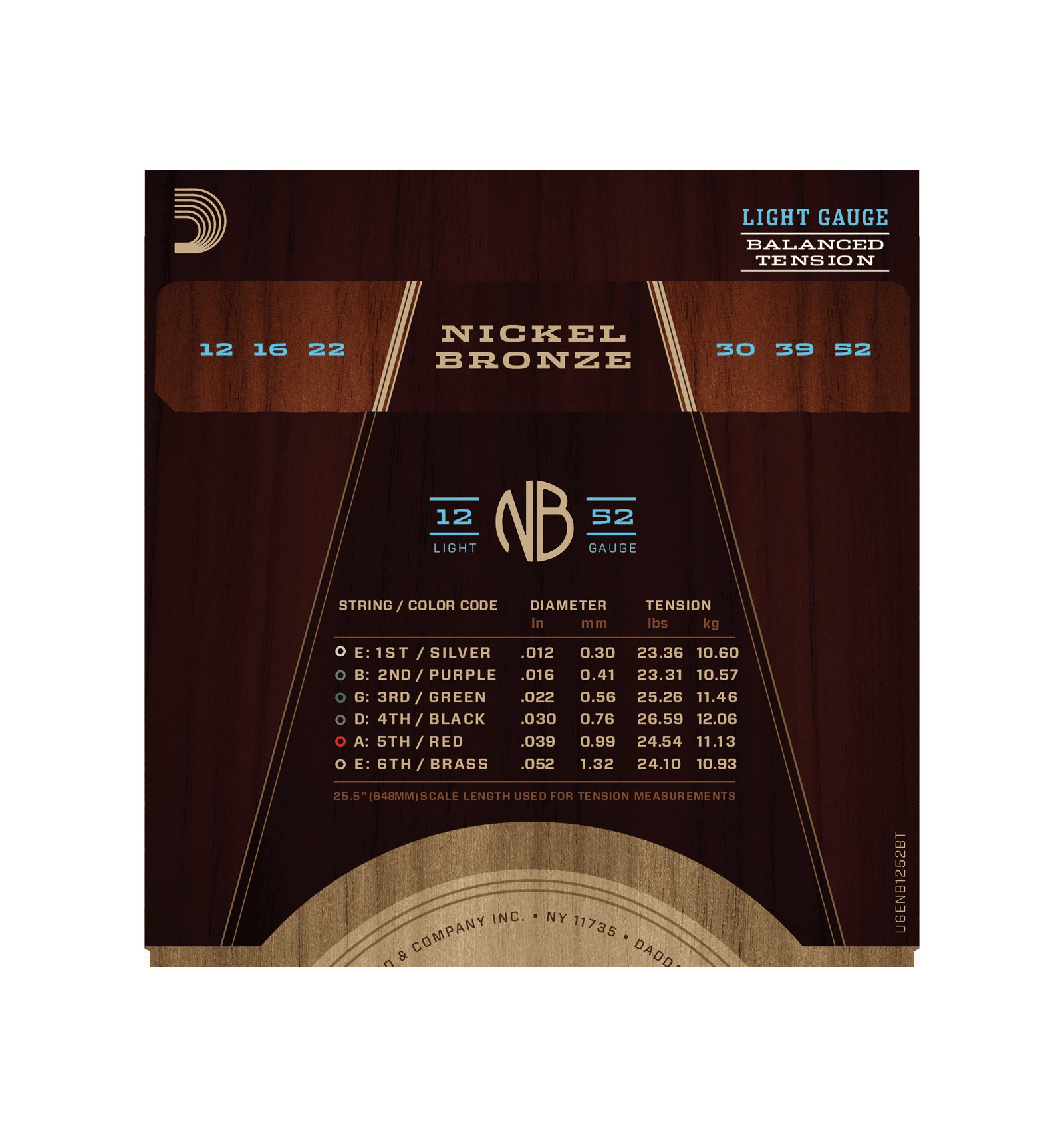 Juego de cuerdas guitarra acústica D’Addario Nickel Bronze NB1047 (010, 014, 023, 030, 039, 047). Las cuerdas Nickel Bronze cuentan con una combinación innovadora de bronce fosforado niquelado entorchado alrededor de un núcleo de acero NY de alto carbono, diseñadas para resaltar las características tonales únicas de cualquier guitarra y permitir que su sonido natural brille.