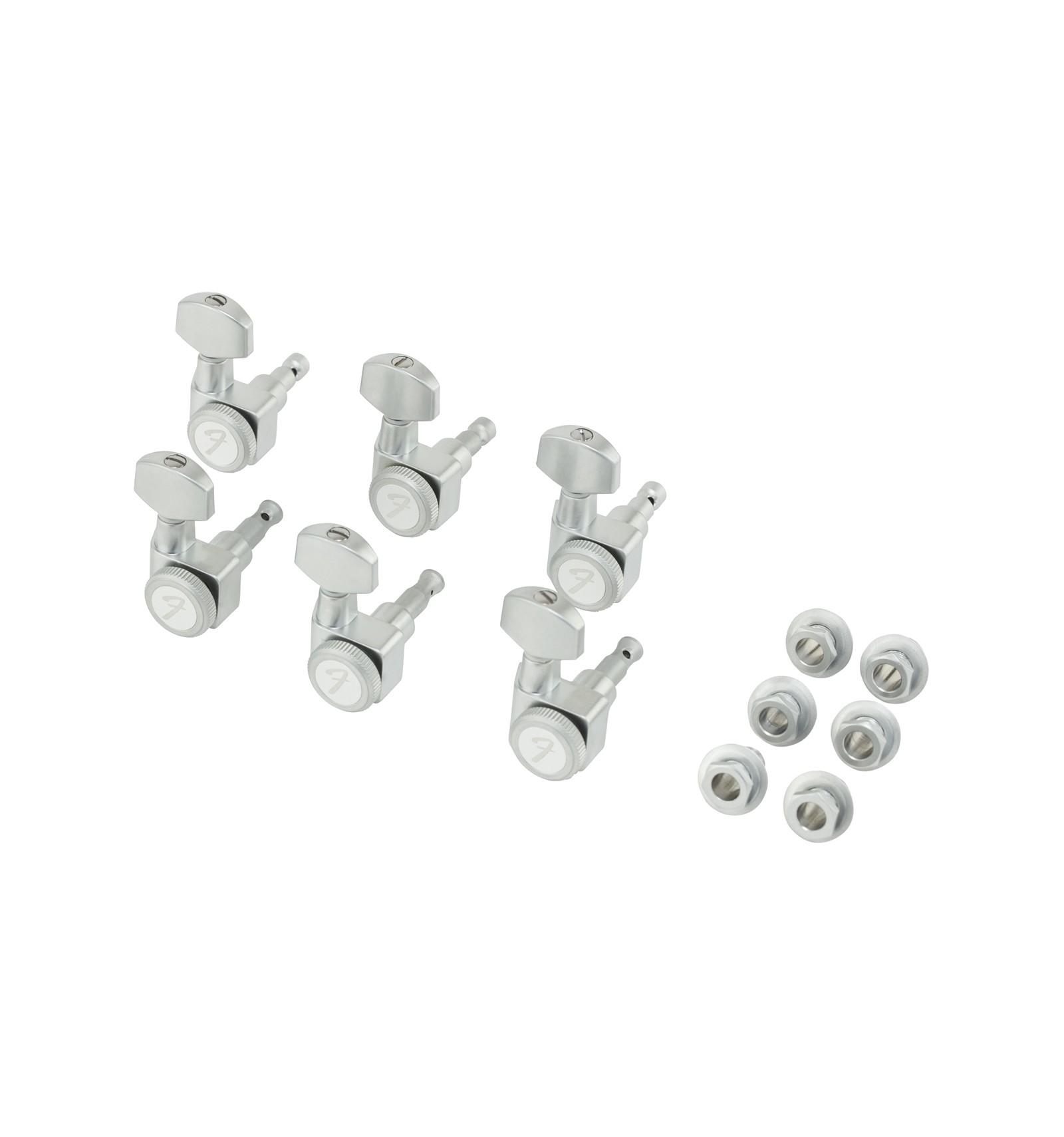 Set of six locking tuners designed to fit most modern-style Fender electric guitars with dual-pin mounting configuration. Tall post tuners are used for the wound strings and shorter post tuners are used for the plain strings. Staggered tuners increase the break angle over the nut and improve tuning stability.