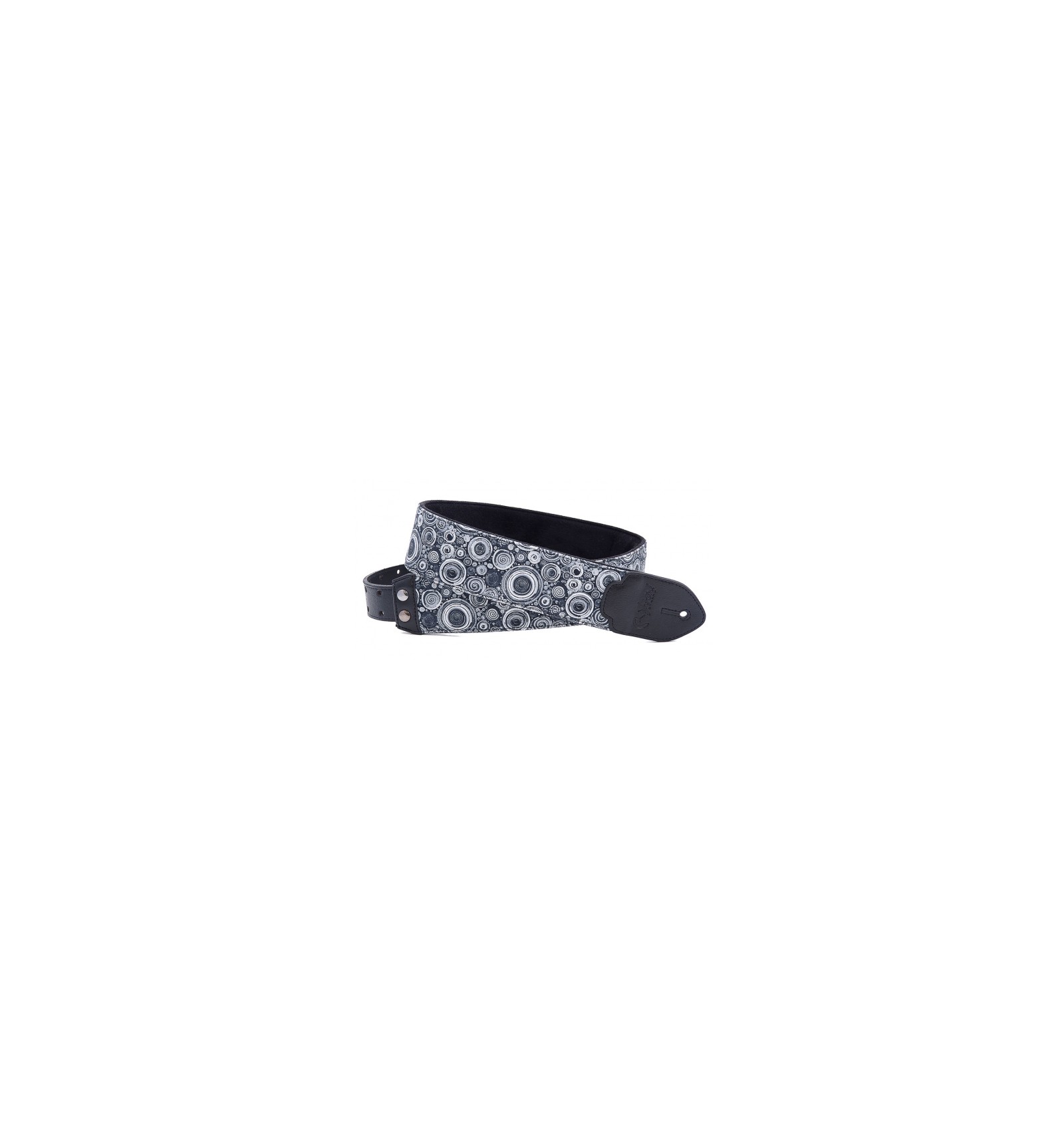 Correa para guitarra y bajo hecha en España. Fabricada con materiales textiles con un divertido estampado, las puntas son 50% sintéticas 50% piel de alta calidad. Con el exclusivo sistema de ajuste RAS lleva también un portapúas incorporado.
