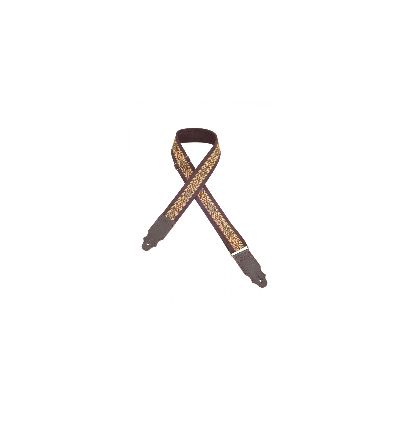 Correa para guitarra y bajo fabricada en España con microfibra técnica antideslizante, acolchado de látex de baja densidad de 2mm de grosor, puntas de piel de bovino de alta calidad y adornada con una cenefa bordada de estilo étnico. Muy ligera y especialmente cómoda, con sistema de ajuste tradicional.