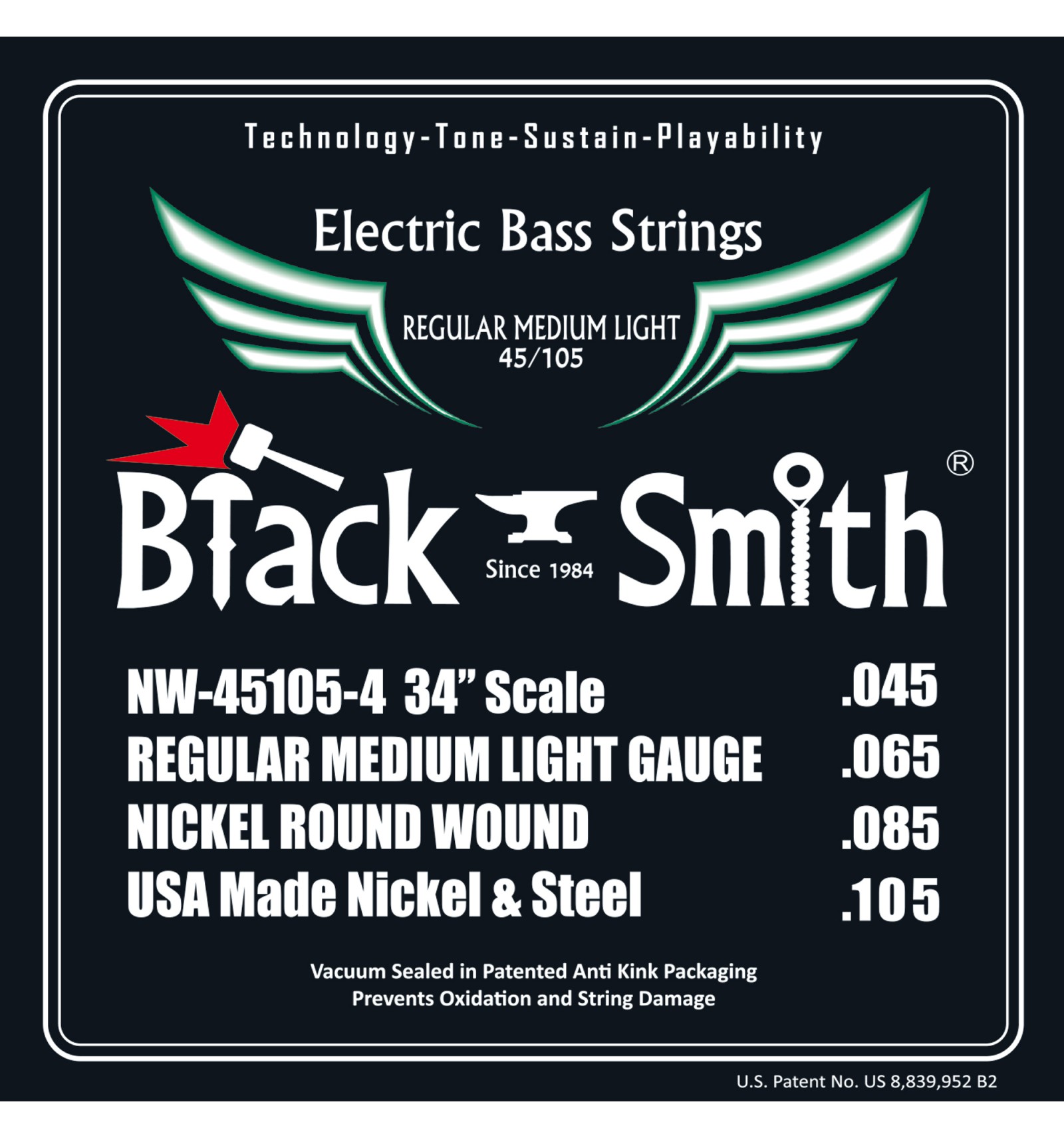 Black Smith fabrique des cordes de grande qualité pour basse électrique. Le filage rond en acier nickel (matériaux fabriqués aux USA) est exécuté sur une âme hexagonale haute qualité avec un système de contrôle automatique par ordinateur. Ces cordes offrent une balance parfaite entre son, jouabilité et sustain.