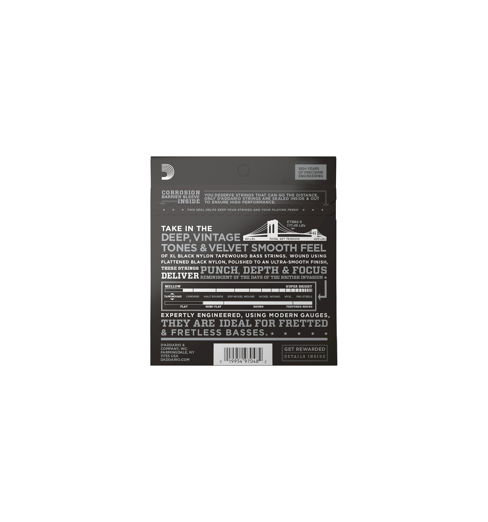 Le ETB92-5 est la version 5 cordes du populaire jeu pour basse ETB92 avec filet en nylon noir. Avec l'ajout d'une corde de Si grave de tirant .135, le jeu ETB92-5 est l'association idéale d'un son chaud et profond avec un toucher confortable. Convient aux basses « long scale » pour un manche pouvant mesurer jusqu'à 36" (91,44 cm).